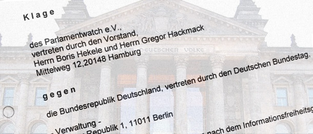 Inzwischen ist die dreizehn Seiten lange Klageschrift unseres gemeinnützigen Vereins Parlamentwatch e.V. beim Berliner Verwaltungsgericht eingegangen und wurde der Beklagten, "die Bundesrepublik Deutschland, vertreten durch den Deutschen Bundestag", zugestellt. Ein Termin für die Verhandlung steht noch nicht fest.