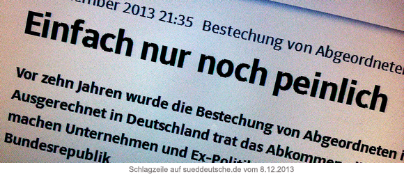 "Peinlich, peinlich" bzw. "Einfach nur noch peinlich" ist der angesprochene Artikel in der Print- bzw. Onlineausgabe der SZ überschrieben, in dem u.a. Wirtschaftsvertreter von Siemens und dem Chemieunternehmen Lanxess die künftige Bundesregierung zum Handeln auffordern: "Es ist ein Anachronismus, dass sich Deutschland in dieser Frage isoliert." Denn mit der jetzigen Gesetzeslage erfüllt Deutschland nicht einmal die Mindeststandards der Vereinten Nationen und kann im Gegensatz zu 168 Ländern eine UN-Konvention gegen Korruption nicht umsetzen:
