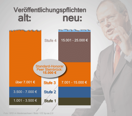 Der Grund für das lausige Transparenz-Plus liegt in der Ausgestaltung des Zehn-Stufen-Systems, das nun an die Stelle des bisherigen Drei-Stufen-Modells tritt. Denn Union und FDP haben erst bei Einkünften ab 15.001 Euro neue Veröffentlichungsstufen eingezogen, alles andere bleibt wie gehabt. Und so kommt es, dass die neuen Transparenzregeln ausgerechnet bei Vortragsmillionär Steinbrück ins Leere laufen: Sein Standardhonorar von 15.000 Euro pro Vortrag liegt nämlich genau einen Euro unter der Grenze zur nächsthöheren Veröffentlichungsstufe (Stufe 4):