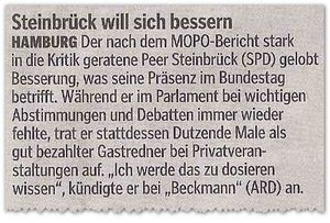 Etwas Gutes hat die andauernde öffentliche Konfrontation Steinbrücks mit seinen geschwänzten Bundestagssitzungen immerhin. Erstmals äußerte er bei Beckmann leise Selbstkritik und gab zu verstehen, dass er mit seinen zahlreichen Honorarvorträgen bei gleichzeitiger Abwesenheit im Parlament in der Vergangenheit vielleicht etwas überzogen hat: „Ich werde das zu dosieren wissen“.