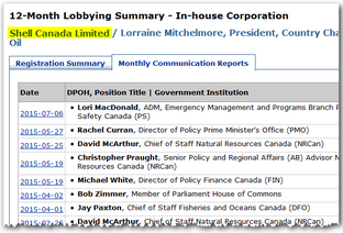Wie umfangreich die Daten in Kanada sind, zeigt das Beispiel der Treffen von Shell Canada mit Politikern. Allein für die vergangenen zwölf Monate werden in der Datenbank mehr als drei Dutzend Zusammenkünfte von Konzernchefin Lorraine Mitchelmore mit Abgeordneten und Regierungsvertretern aufgeführt. Zusätzlich muss die Shell-Chefin angeben, an welchen gesetzlichen Regelungen sie mitgewirkt hat.