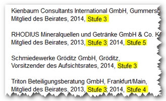 Hierzu muss man wissen: Die Zusatzeinkünfte eines Abgeordneten werden auf der Bundestagshomepage nicht als Euro-Beträge aufgeführt, sondern in Form von Stufen (s. Grafik). Stufe 3 entspricht beispielsweise Nebeneinkünften zwischen 7.000 und 15.000 Euro, die Höchststufe 10 kennzeichnet einen Verdienst von "mindestens 250.000 Euro". Dieses intransparente Stufensystem führt dazu, dass große Teile der Nebeneinkünfte im Dunkeln bleiben, nach einer abgeordnetenwatch.de-Berechnung insgesamt bis zu 10 Mio. Euro seit Beginn der Legislaturperiode.