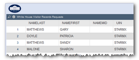• Auf der offiziellen Homepage des Weißen Hauses werden die Besucher des Präsidentensitzes aufgeführt (s. rechts). Alle Daten sind per offener Schnittstelle verfügbar, sodass z.B. die Washington Post eine App entwickeln konnte, die Besuche auch gleich grafisch darstellt.