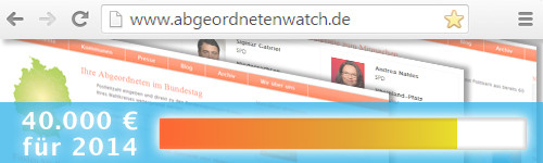 Mitte November haben wir dazu aufgerufen, uns auch im neuen Jahr zu unterstützen und uns bei der Finanzierung von abgeordnetenwatch.de unter die Arme zu greifen. Von den 40.000 Euro, die uns für einen soliden Start in das Jahr 2014 noch fehlten, sind mittlerweile 32.519 Euro durch Ihre Spenden zusammengekommen. Herzlichen Dank für diese überwältigende Unterstützung!
