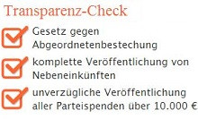 Die Auswertung des Transparenz-Checks ist da. Im Vorfeld der Bundestagswahlen wurden alle Abgeordneten befragt, welche Forderungen sie unterstützen: ein Gesetz gegen Abgeordnetenbestechung, die komplette Veröffentlichung von Nebeneinkünften sowie die unverzügliche Veröffentlichung aller Parteispenden über 10.000€.