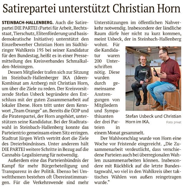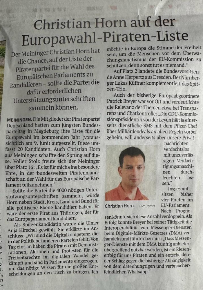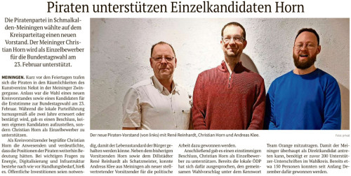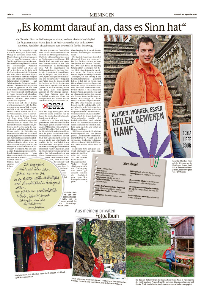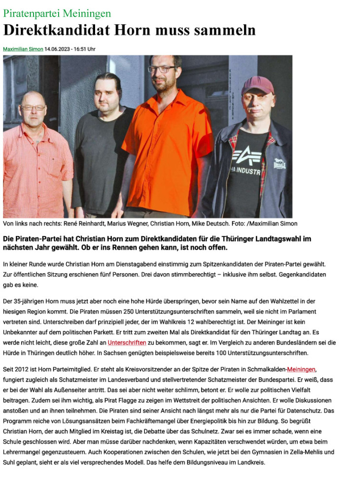 Als Direktkandidat habe ich mich aufstellen lassen, weil ich schon fünf Jahre aktiv vor Ort in der Piratenpartei bin und mit den Gegebenheiten der Region vertraut bin. Ich wohne schon über 25 Jahre in Meiningen, habe in Schmalkalden studiert, wo ich auch arbeite, deshalb kenne ich die Probleme der Menschen vor Ort. Außerdem habe ich Lust in den öffentlichen Diskurs einzugreifen. Dazu bietet die Bundestagswahl eine hervorragende Gelegenheit.