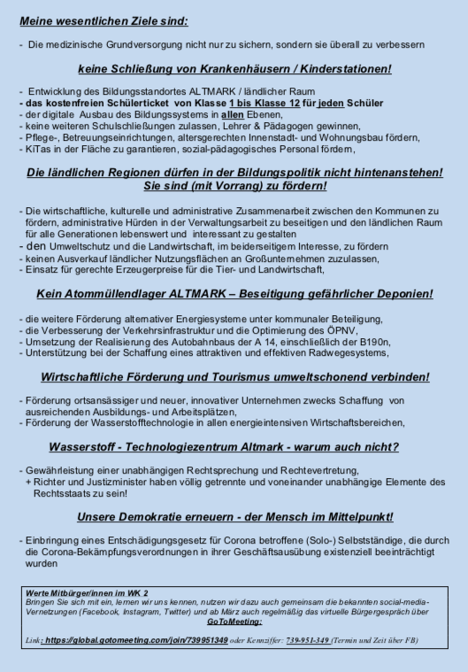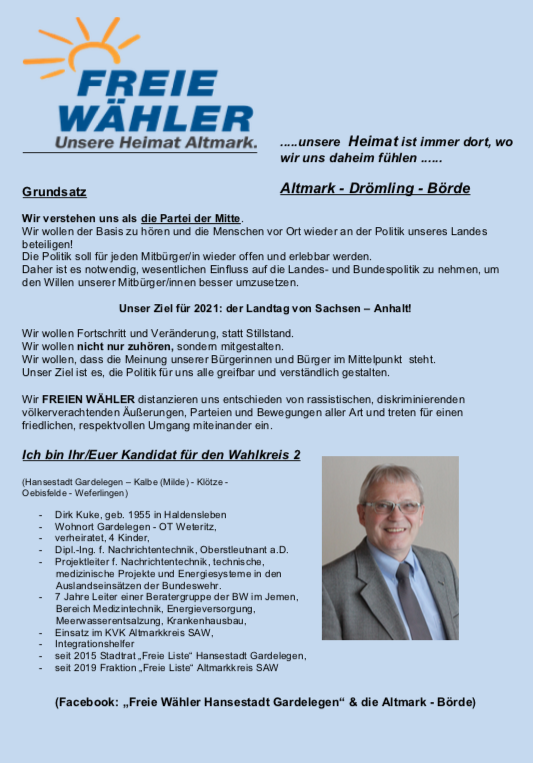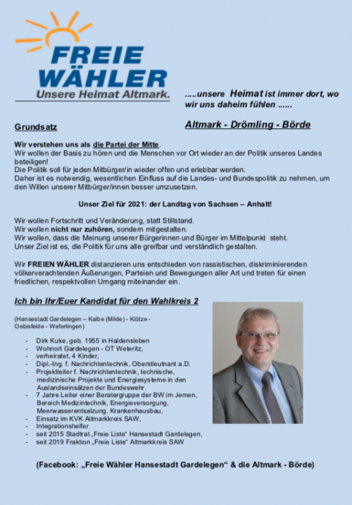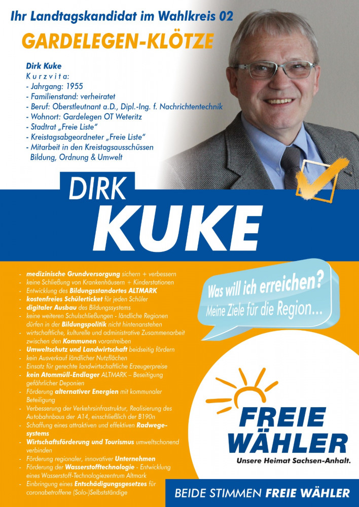 Über Dirk KukeAusgeübte Tätigkeit Oberstleutnant a.D.Berufliche Qualifikation Diplom Ingenieur für NachrichtentechnikWohnort GardelegenGeburtsjahr 1955Dirk Kuke schreibt über sich selbst: Meine Vita kann der Galerie entnommen werden.Wesentlich ist für mich ist, dass ich als FREIER WÄHLER den unabhängigen Wählergemeinschaften , Freien Listen, Bürgerinitiativen eine Stimme im Landesparlament geben kann ! Mehr anzeigen Weniger anzeigen Kandidaturen und Mandate Kandidat Sachsen-Anhalt Wahl 2021 Angetreten für: FREIE WÄHLER Wahlkreis: Gardelegen-Klötze Wahlkreis Gardelegen-KlötzeWahlliste Landesliste FREIE WÄHLERListenposition 12kandidierendencheck Sachsen-Anhalt Wahl 2021Galerie Weiterführende LinksFacebook: Freie Wähler Hansestadt Garde…