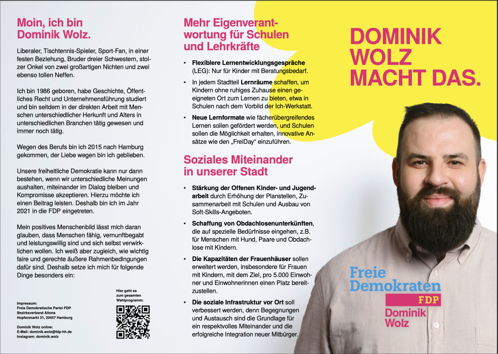 Liberaler, Tischtennis-Spieler, Sport-Fan, in einer festen Beziehung, Bruder dreier Schwestern, stol- zer Onkel von zwei großartigen Nichten und zwei ebenso tollen Neffen. Ich bin 1986 geboren, habe Geschichte, Öffent- liches Recht und Unternehmensführung studiert und bin seitdem in der direkten Arbeit mit Men- schen unterschiedlicher Herkunft und Alters in unterschiedlichen Branchen tätig gewesen und immer noch tätig. Wegen des Berufs bin ich 2015 nach Hamburg gekommen, der Liebe wegen bin ich geblieben. Unsere freiheitliche Demokratie kann nur dann bestehen, wenn wir unterschiedliche Meinungen aushalten, miteinander im Dialog bleiben und Kompromisse akzeptieren. Hierzu möchte ich einen Beitrag leisten. Deshalb bin ich im Jahr 2021 in die FDP eingetreten. Mein positives Menschenbild lässt mich daran glauben, dass Menschen fähig, vernunftbegabt und leistungswillig sind und sich selbst verwirk- lichen wollen. Ich weiß aber zugleich, wie wichtig faire und gerechte äußere Rahmenbedingungen dafür sind.