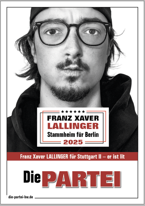 Fragen und Antworten Frage von Felix S. • 14.02.2025 Wie stehen Sie zu Stuttgart 21? Welche Bedeutung hat für Sie der Kopfbahnhof? Wie stehen Sie zu den Plänen die Gäubahn über Jahre vom Kopfbahnhof abzubinden? Wie stehen Sie zur Panoramabahn? Antwort ausstehend von Franz Xaver Lallinger Die PARTEI Bundestag Wahl 2025 Bahnverkehr Alle Fragen und Antworten Über Franz Xaver LallingerGeburtsname Franz-Xaver LallingerAusgeübte Tätigkeit RadiomoderatorBerufliche Qualifikation Vollumfänglich ausgebildetWohnort StuttgartGeburtsjahr 1997Kandidaturen und Mandate Kandidat Bundestag Wahl 2025 Angetreten für: Die PARTEI Wahlkreis: Stuttgart II Wahlkreis Stuttgart IIFragen und AntwortenGalerie Weiterführende LinksAuf Instagram bin ich witziger, schwöre!