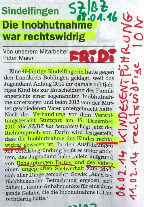 Rechtswidrige Inobhutnahme, AZ 9 K 40/15 VG Stuttgart