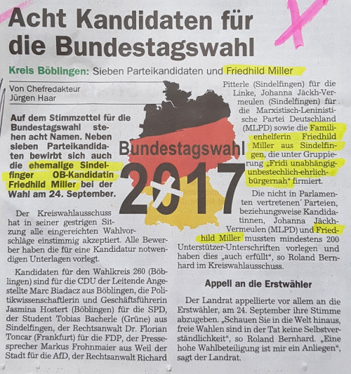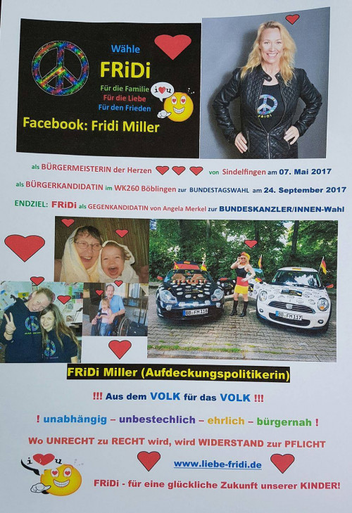 BTW Kandidatin 2017/2021/2025, an über 112 BM-Wahlen teilgenommen, jede Rede selbst geschrieben, Wahlkämpfe aus Privatvermögen bezahlt, plakatiere selbst, Mitglied bei Freunde der Demokratie (Bürger-/Volksentscheide auf allen Ebenen), im Hospizverein, im Erzengel-Verein (Kinderschutz)