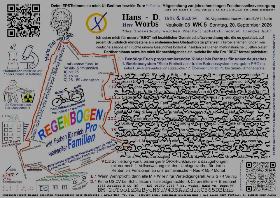 Mein Berlin hat zumindest 96 Ortsteile und dortige Landsleute geben mir mit jenen „eigenen“ Worten oder die mir von Euch „gezeigten“ unsere auch Sicherheitslösungen für bisher viel Falsches in Deutschland seit 1995. 20.09.2026©Hr.Worbs+60%Ziel_Pro_Erde-Mensch