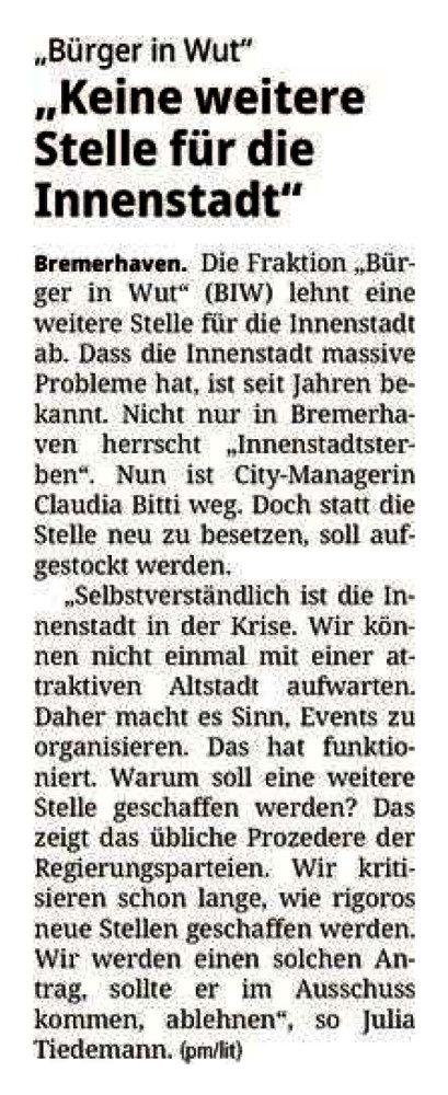 Außerdem stehe ich für eine maßvolle, aber sinnvolle Personalpolitik in der Verwaltung. Personelle Ressourcen im Magistrat müssen optimal eingesetzt werden. Dadurch wird nicht nur eine effektivere personelle Auslastung gewährleistet, sondern es werden auch Steuergelder gespart, die an so vielen anderen Stellen in unserer Seestadt fehlen. Zudem würden dem privaten Sektor weniger notwendige Fachkräfte entzogen.