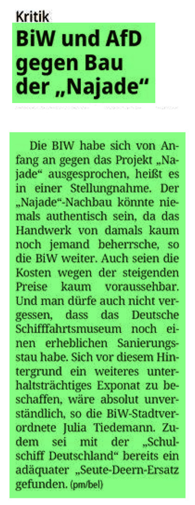 Zu dieser Steuergeldverschwendung zählt sicherlich auch die geplante Najade, die Millionen an Bundes- und Bremerhavener Steuergelder verschlingen wird, sollte das Projekt umgesetzt werden. Ebenso die Millionengräber OTB und Hafentunnel. Leider sind diese Züge abgefahren, aber das Geld hätte sinnvoller eingesetzt werden können. Dies sind nur drei der zahlreichen Beispiele für die Steuerverschwendung in unserer Seestadt.