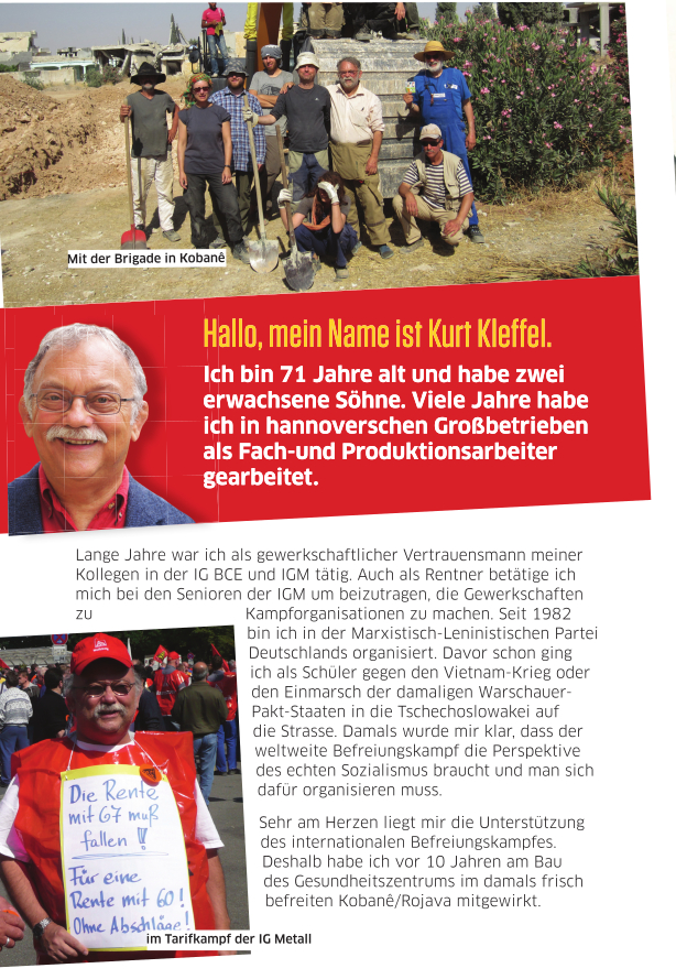 Sehr am Herzen liegt mir die Unterstützung des internationalen Befreiungskampfes. Deshalb habe ich vor 10 Jahren am Bau des Gesundheitszentrums im damals frisch befreiten Kobanê/Rojava mitgewirkt.