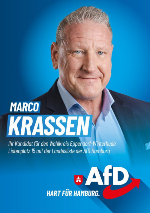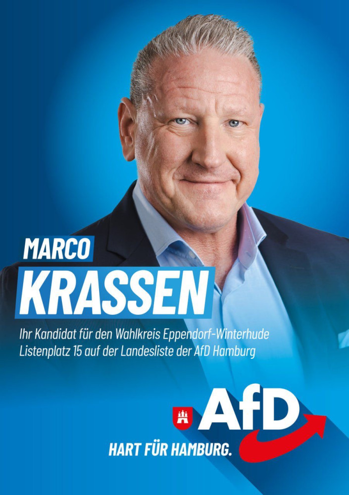 Über Marco KrassenAusgeübte Tätigkeit CoachBerufliche Qualifikation BankkaufmannWohnort HamburgGeburtsjahr 1972Kandidaturen und Mandate Kandidat Hamburg Wahl 2025 Angetreten für: AfD Wahlkreis: Eppendorf - Winterhude - Hoheluft-Ost Wahlkreis Eppendorf - Winterhude - Hoheluft-OstWahlliste Landesliste AfDListenposition 15kandidierendencheck Hamburg Wahl 2025Galerie