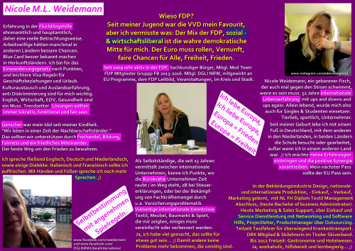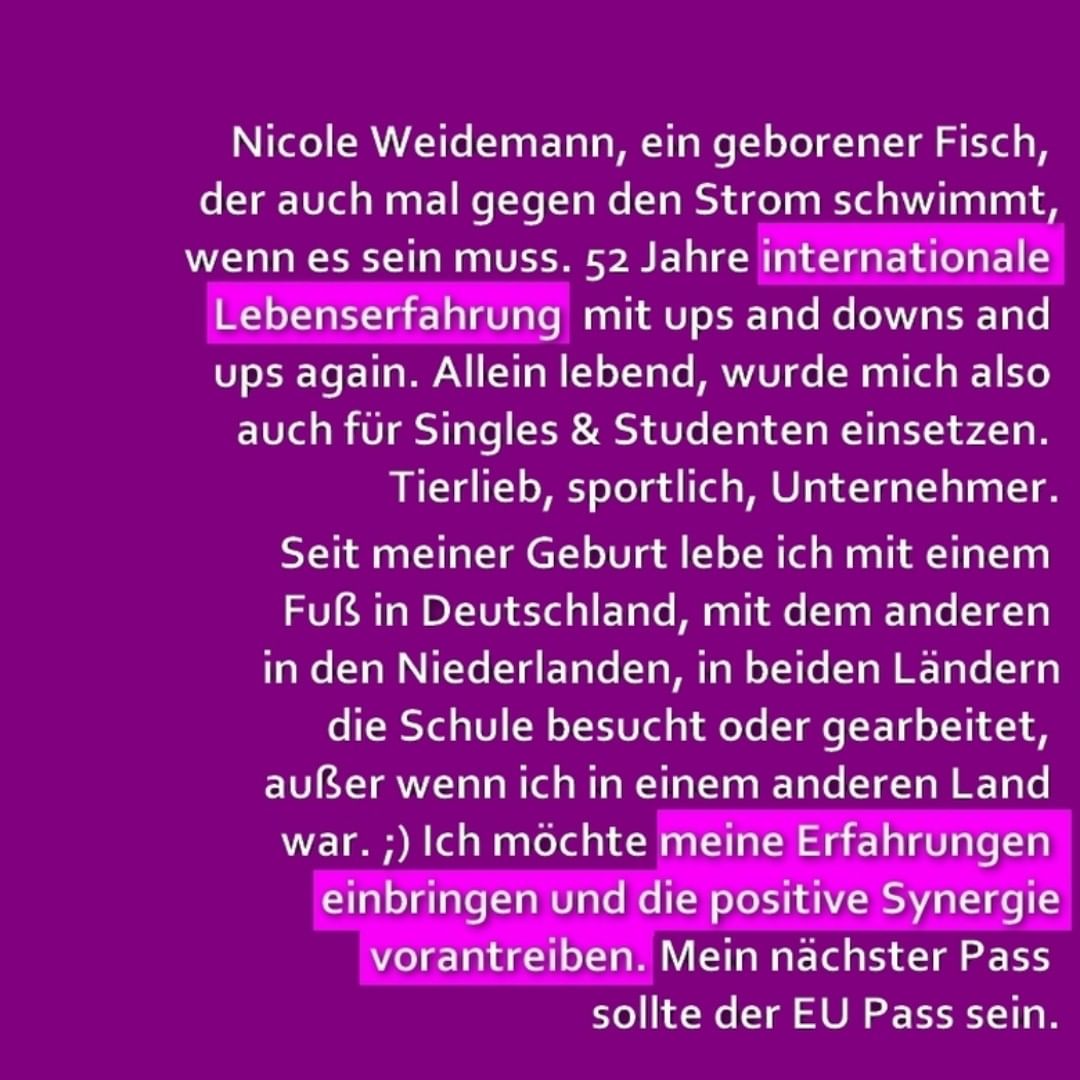 Über Nicole WeidemannAusgeübte Tätigkeit Selbst. Marketing, Service Dienstl. Handel, Baumarkt BrancheBerufliche Qualifikation NL Diplom Textil Management (FH)Geburtsjahr 1966Nicole Weidemann schreibt über sich selbst: Aufgestellt aus dem Landesverband Nordrhein-Westfalen. Mehr anzeigen Weniger anzeigen Kandidaturen und Mandate Kandidatin EU-Parlament Wahl 2019 Angetreten für: FDP Wahlliste: Bundesliste Wahlliste BundeslisteListenposition 51kandidierendencheck EU-Parlament Wahl 2019Galerie Weiterführende LinksWebsite von Nicole WeidemannFacebook Nicole WeidemannInstagram unter Künstlername, etwas Pri…Twitter von Nicole Weidemann