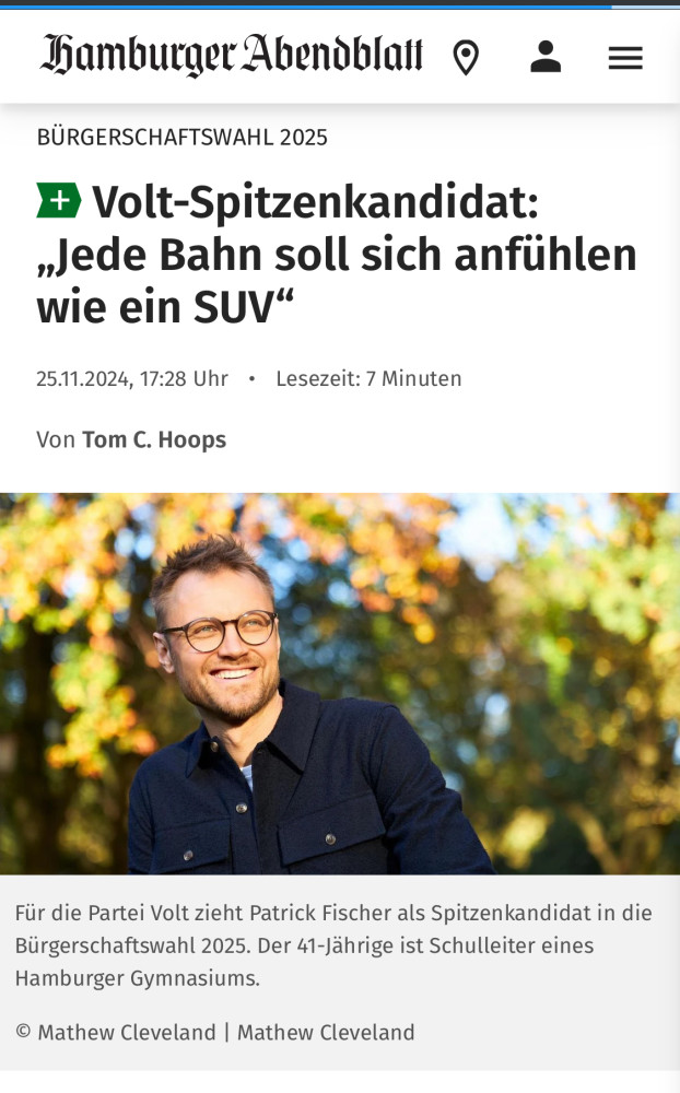 Bei den Bürgerschaftswahlen im März 2025 ist es mir eine große Freude, die Landesliste von Volt Hamburg als Spitzendkandidierender anführen zu können.