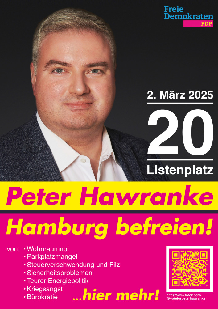 Wenn Sie auf der Landesliste der FDP Platz 20 und im Wahlkreis Hamburg Mitte auf Platz 3 mir jeweils Ihre 5 Stimmen geben, dann geben Sie mir als Person die Stimmen und ich kann mich dadurch hochkämpfen und in die Bürgerschaft reinkommen.