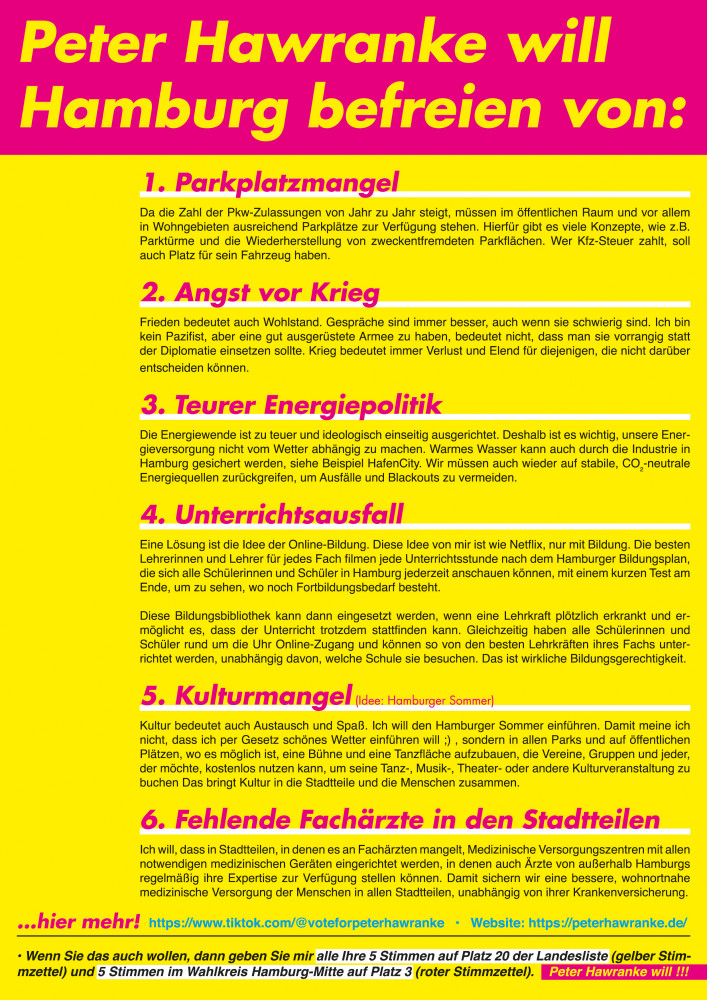 Mein persönlicher Slogan „Hamburg befreien" von diversen Mängeln und Problemen, welche ich aufgelistet habe, bei gleichzeitiger Lösungsidee hierzu, passt zu meiner Freiheitsliebe und meinem Gefühl, dass in unserer Stadt vieles nicht mehr gut läuft. Ich behandle einige Themen in meinen Videos auf meinen sozialen Medienkanälen und lade gerne ein, sich hier ein Bild über mich als Person und meine Positionen zu machen.