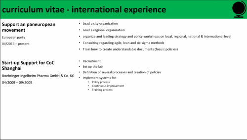 - Warum ich für Volt kandidiere: Durch die etablierten Parteien habe ich mich nicht mehr repräsentiert gefühlt. Mir schwebte die Gründung einer europäischen Partei vor. Als ich bemerkt hatte, dass die Idee schon jemand hatte, musste ich mir das genauer anschauen. Nach kurzer Recherche war ich vom Programm und den Videos, die ich finden konnte begeistert. Am nächsten Tag besuchte ich eine Wahlkampfveranstaltung in Mainz und ich hatte zum ersten Mal das Gefühl, die Menschen gefunden zu haben, mit denen ich gemeinsam die Welt verändern möchte. Zwei Jahre später kann ich sagen, es war nicht nur Liebe auf den ersten Blick, es ist auch Liebe auf Dauer. Mittlerweile bin ich im Parteivorstand von Volt Rheinland-Pfalz, Listenplatz 2 und Direktkandidat und möchte ein politische Alternative anbieten, die nicht auf Hass und Abgrenzung sondern auf einem positiven Menschenbild und das gemeinsame Meistern von Herausforderungen aufbaut.