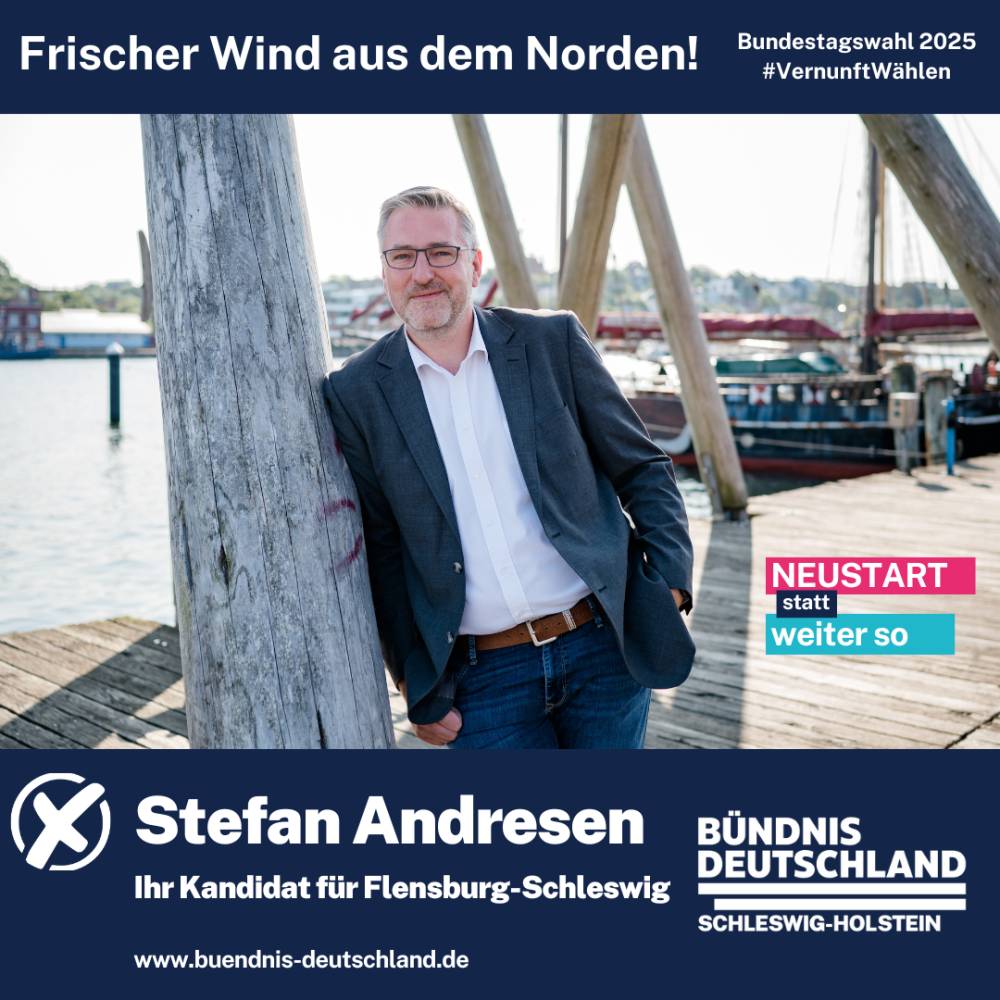 Bei der Bundestagswahl kandidiere ich als IHR Wahlkreiskandidat für Flensburg-Schleswig sowie als Spitzenkandidat der Landesliste von BÜNDNIS DEUTSCHLAND.