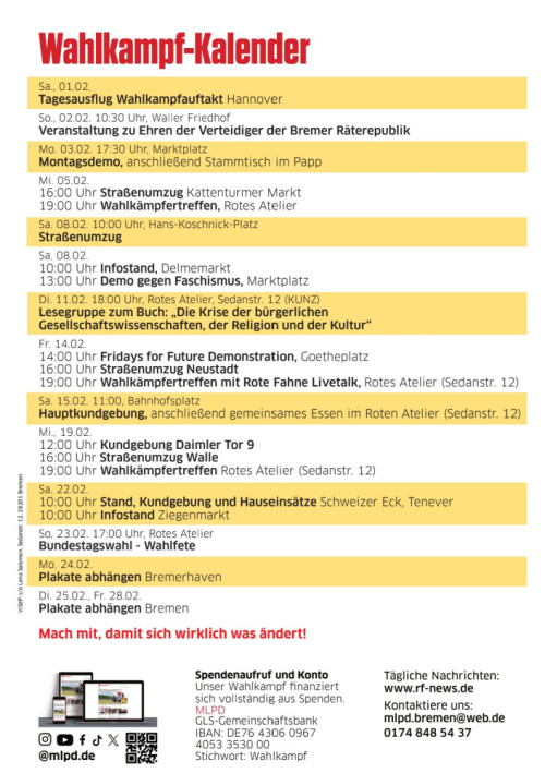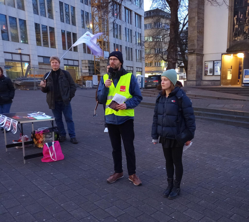 In den USA wird mit Trump ein Faschist Präsident. Die AfD wittert Morgenluft. CDU, FDP und auch BSW paktieren mit der faschistischen AfD, wollen das Asylrecht komplett abschaffen. Die SPD hat die Rechtsentwicklung selbst in der Regierung gefördert. Kein Fußbreit dem Faschismus!