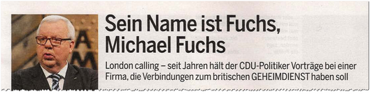 Dass der stellvertretende CDU-Fraktionsvorsitzende zum Hörer greift um wegen eines bevorstehenden Berichts "weiter oben" in der Redaktionshierarchie zu intervenieren, wirft ein seltsames Licht auf einen Volksvertreter, der sich selbst nichts vorzuwerfen hat. Kürzlich hatte Michael Fuchs in einem Fernsehbeitrag behauptet, er habe zu seiner langjährigen Nebentätigkeit "immer das Richtige angegeben". Auch sei die von MI6-Agenten gegründete Hakluyt & Company" eine "höchst seriöse, höchst honorige Firma". Honorige Firma, korrekte Angaben - warum beschwerte Fuchs sich dann über die STERN-Recherchen?