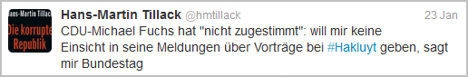 Gegen die Berichterstattung von abgeordnetenwatch.de war der stellvertretende CDU-Fraktionsvorsitzende kürzlich mit einer Unterlassung vorgegangen. Auch der Blog netzpolitik.org wurde von Fuchs abgemahnt. Erschwert werden weitere Recherchen dadurch, dass derr CDU-Fraktionsvize Journalisten einen Einblick in jene Angaben verweigert, die er gegenüber der Bundestagsverwaltung zu seiner Tätigkeit für Hakluyt & Company gemacht hat. STERN-Reporter Hans-Martin Tillack twitterte gestern: