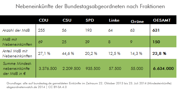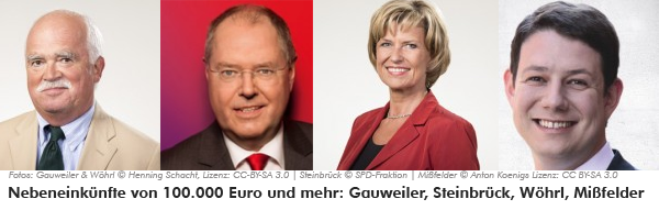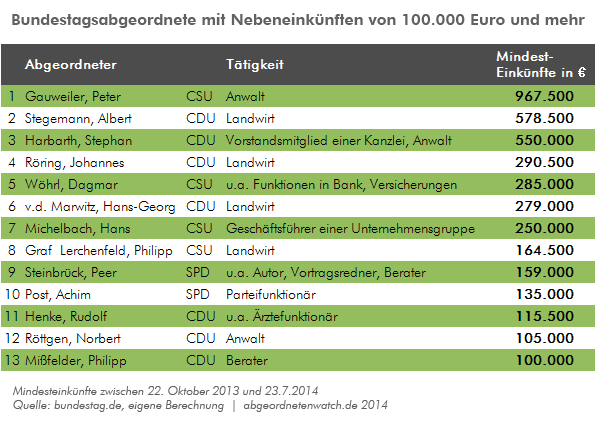 Da die Abgeordneten ihre Nebeneinkünfte auf der Parlamentshomepage lediglich in zehn groben Verdienststufen angeben müssen, lassen sich keine genauen Angaben über die tatsächliche Höhe machen. Bei den im folgenden aufgeführten Nebeneinkünften der Spitzenverdiener handelt es sich deswegen um Mindestbeträge. In Wirklichkeit dürften die Einkünfte z.T. deutlich höher liegen.