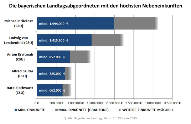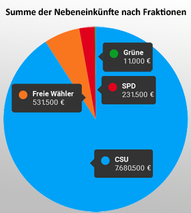 Insgesamt haben 48 der 180 Abgeordneten im Bayerischen Landtag seit Oktober 2013 eine zusätzliche entgeltliche Nebentätigkeit gemeldet. Die Einkünfte belaufen sich zusammen auf mindestens 8,4 Millionen Euro. (Zum Vergleich: Die Abgeordneten des Deutschen Bundestages kamen in den vergangenen zwei Jahren auf Nebeneinkünfte von mindestens 11,6 Millionen Euro. Dort haben 151 der 631 Parlamentarier einen Nebenverdienst.)