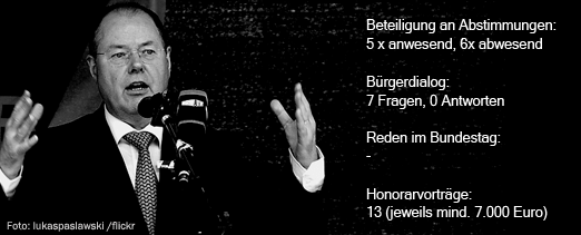 Im neuen Bundestag habe sich Steinbrück nach Angaben des Portals abgeordnetenwatch.de bislang kaum aktiv betätigt, hieß es in dem Bericht. So fehlte er bei zahlreichen namentlichen Abstimmungen. Stattdessen ging der frühere Minister einer regen Tätigkeit außerhalb des Bundestages nach.