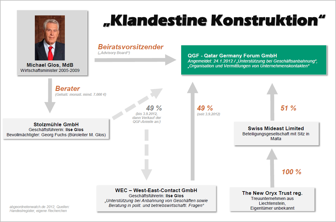 Nach Recherchen von abgeordnetenwatch.de und dem STERN verbirgt sich hinter der Qatar Germany Forum GmbH ein verästeltes Firmengeflecht, das bis nach Liechtenstein reicht. Denn der Mehrheitsgesellschafter der QGF, die maltesische Swiss Mideast Limited, gehört einem liechtensteiner Treuunternehmen namens The New Oryx Trust. Die Hintermänner des Trusts sind selbst den dortigen Behörden unbekannt, was nach liechtensteinischem Recht möglich ist. Auf Anfrage erklärte Michael Glos, auch er wisse nichts über die Eigentümer.