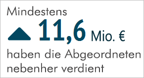 Nach unseren Berechnungen haben die Bundestagsabgeordneten in dieser Legislaturperiode mindestens 11,6 Mio. Euro zusätzlich zu ihren Diäten kassiert. Genauere Aussagen sind nicht möglich, da Parlamentarier keine konkreten Beträge mitteilen sondern ihre Einkünfte lediglich einer von zehn Verdienststufen zuordnen müssen (die Angabe "Stufe 3" entspricht z.B. Einkünften zwischen 7.000 und 15.000 Euro).