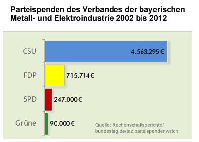 Der einflussreiche Metallverband, in dem sich u.a. die bayerischen Fahrzeugbauer BMW, Audi und MAN sowie der Luft- und Raumfahrtkonzern EADS zusammengetan haben, gehört zu den bedeutendsten Großspendern in Deutschland. Allein in den vergangenen zehn Jahren schüttete der VBM mindestens 5,6 Mio. Euro an die Parteien aus. Ein Großteil davon - etwa 4,5. Mio Euro - entfiel auf die CSU. Die FDP, seit 2008 an der bayerischen Landesregierung beteiligt, erhielt rund 715.000 Euro. An die beiden Oppositionsparteien SPD und Grüne überwies der VBM 247.000 bzw. 90.000 Euro.