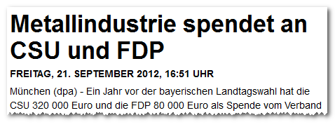 Ein Jahr vor der bayerischen Landtagswahl haben zwei Großspenden den Regierungsparteien CSU und FDP 320.000 bzw. 80.000 Euro in die Wahlkampfkasse gespült. Die Zuwendungen stammen vom Verband der bayerischen Metall- und Elektroindustrie (VBM) und gingen Anfang September auf den Parteikonten ein.