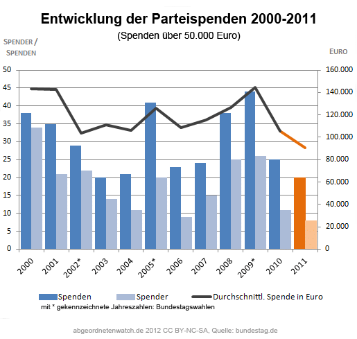 Doch die Liste der Geldgeber ist zuletzt immer kürzer geworden. 2011 unterstützten die Parteien gerade einmal acht Großspender (2010: elf) mit Zuwendungen oberhalb von 50.000 Euro; zwischen 2000 und 2009 waren es im Schnitt 20. Selbst wenn man aus dieser Rechnung die Wahljahre 2002, 2005 und 2009 heraus rechnet, in denen sich besonders viele Unternehmer und Verbände mit einer üppigen Spende in Erinnerung rufen, kommt man auf durchschnittlich 18 Großspender pro Jahr.