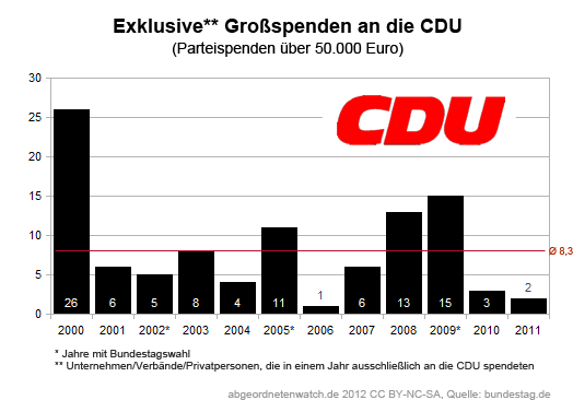 Doch die innige (Finanz-)Beziehung zwischen CDU und Privatwirtschaft ist merklich abgekühlt. Nur noch wenige Geldgeber können sich für die Regierungspartei erwärmen, wie eine Auswertung von abgeordnetenwatch.de zeigt: 2010 wurden die Christdemokraten lediglich von drei Exklusiv-Spendern unterstützt, 2011 sogar nur noch von zweien.
