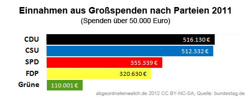 Wie die Frankfurter Rundschau am 2.1.2013 berichtete, lag die Gesamthöhe der Großspenden im vergangenen Jahr auf einem erneuten Tiefstand. Insgesamt erhielten die Parteien von Unternehmen Zuwendungen oberhalb von 50.000 Euro in einem Volumen von insgesamt 1,3 Millionen Euro, rund ein Drittel weniger als im Jahr 2011. Die CSU kassierte insgesamt 460.000 Euro, an CDU und SPD flossen jeweils rund 260.000 Euro, die FDP bekam 205.000 Euro.