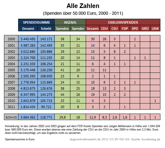 Betrachtet man die Spendenflüsse in den letzten zwei Jahren, macht man eine auffällige Beobachtung: Immer weniger Unternehmen und Verbände spenden an immer mehr Parteien. Während ein Großspender zwischen 2000 und 2009 im Schnitt 1,5 Spenden pro Jahr tätigte, waren es 2010 schon 2,3 und 2011 sogar 2,5 Spenden. Im vergangenen Jahr kamen die insgesamt 20 Zuwendungen, die oberhalb der 50.000 Euro-Grenze lagen, von gerade einmal acht Konzernen und Unternehmensverbänden.