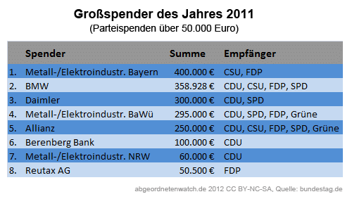 Inzwischen können sich die Parteien, insbesondere CDU, CSU und FDP, nur noch auf wenige Großunternehmen verlassen. Die Autobauer BMW und Daimler, der Versicherer Allianz und die Verbände der Metall- und Elektroindustrie in Bayern, Baden-Württemberg und NRW gehören zu den letzten "Großen", die die Parteien nach wie vor mit hohen Zuwendungen unterstützen. Großspenden kamen im vergangenen Jahr nur noch aus zwei Branchen: der Finanz- und Versicherungswirtschaft sowie der metallverarbeitenden Industrie. Aus den insgesamt 34 Großspendern im Jahr 2000 sind elf Jahre später acht geworden: