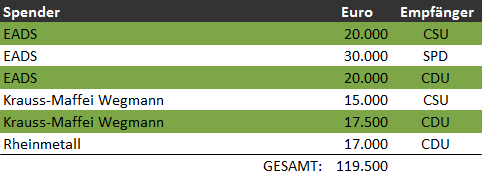 Unter den Parteispendern befanden sich 2012 erneut zahlreiche Rüstungsunternehmen. CDU, CSU und SPD erhielten aus dieser Branche rund 120.000 Euro.