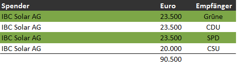 Seit einiger Zeit findet sich auch ein Photovoltaik-Unternehmen unter den Großspendern. Im Rahmen der politischen Landschaftspflege hat die IBC Solar AG auch 2012 gleich mehrere Parteien mit Zuwendungen bedacht - im Zuge der Energiewende zumindest kein Nachteil.