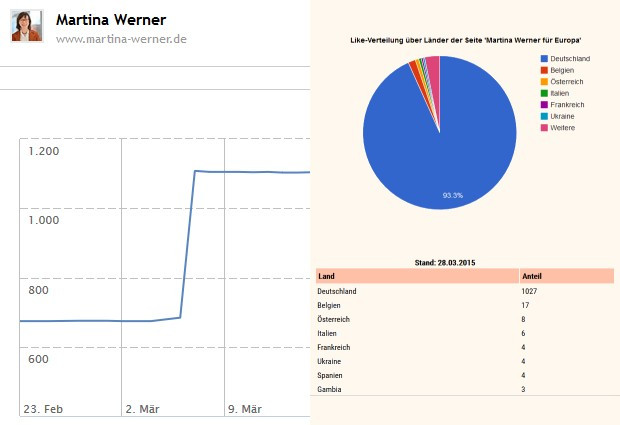 Auf unsere Emailanfrage vom 16.3. reagierte Werner bislang nicht. Darin hatten wir sie nach dem Anstieg von 430 Likes für ihr Facebook-Profil MartinaWernerEuropa an einem einzigen Tag gefragt. Dieser Anstieg kam allerdings von deutschen Facebook-Usern, erscheint aber trotzdem merkwürdig aufgrund des ansonsten eher stagnierenden Verlaufs ihrer Facebook-Likes.