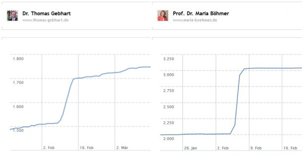 Alles begann mit dem Hinweis eines abgeordnetenwatch.de-Besuchers, der uns darauf aufmerksam machte, dass es auf der Facebook-Fanseite des Bundestagsabgeordneten Thomas Gebhart einen sprunghaften Anstieg der Likes um etwa 15 Prozent gegeben hatte. Wir gehen den Hinweisen aufmerksamer Leserinnen und Leser gerne nach und fanden heraus, dass auch bei Gebharts Kollegin aus dem Nachbarwahlkreis, Maria Böhmer, in fast demselben Zeitraum die Facebook-Likes ebenfalls innerhalb sehr kurzer Zeit sogar um gut 1.000 auf ca. 3.000 angestiegen waren. Und das, obwohl die Zahl ihrer Fans ansonsten eher stagniert und die CDU-Abgeordnete auf Facebook nicht aktiver war als sonst.