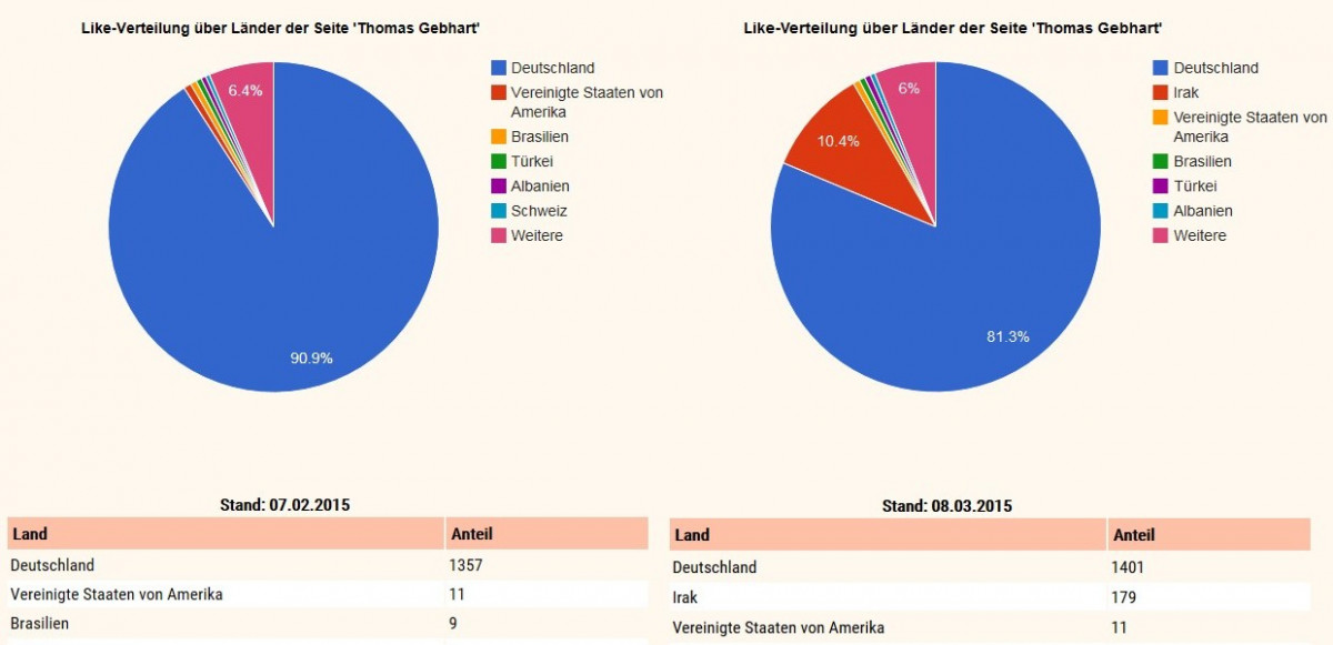 Der hier vorliegende Fall weist nun einige Parallelen auf: Die 200 Likes bei Gebhart sowie die 1.000 Likes bei Böhmer stammen ebenfalls aus dem Ausland, in beiden Fällen aus dem Irak. Mithilfe eines im Auftrag von Stern TV programmierten Online-Werkzeugs kann jeder Internetnutzer herausfinden, aus welchen Ländern die Gefällt-mir-Angaben von Facebook-Fanseiten kommen. Weil die Angaben immer etwa vier Tage zurückliegen, ließ sich bei Thomas Gebhart ein Vorher-Nachher-Vergleich anfertigen: